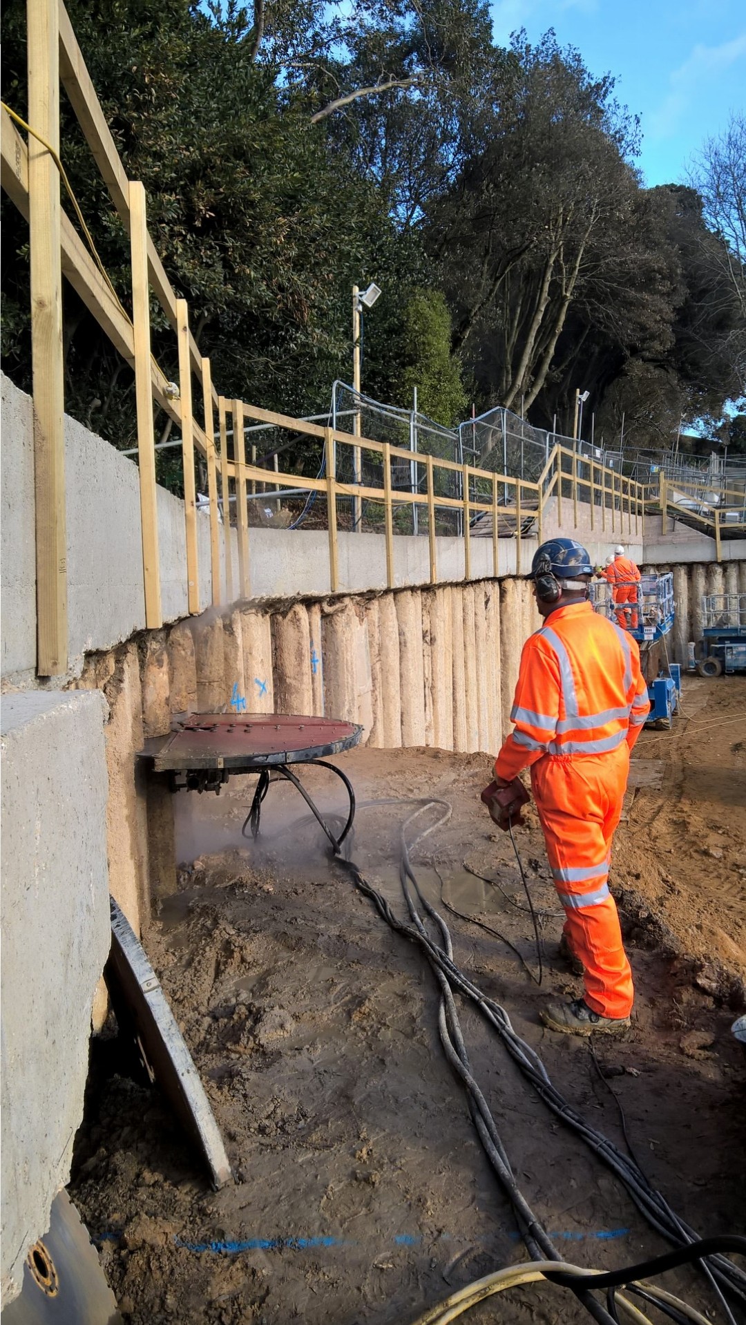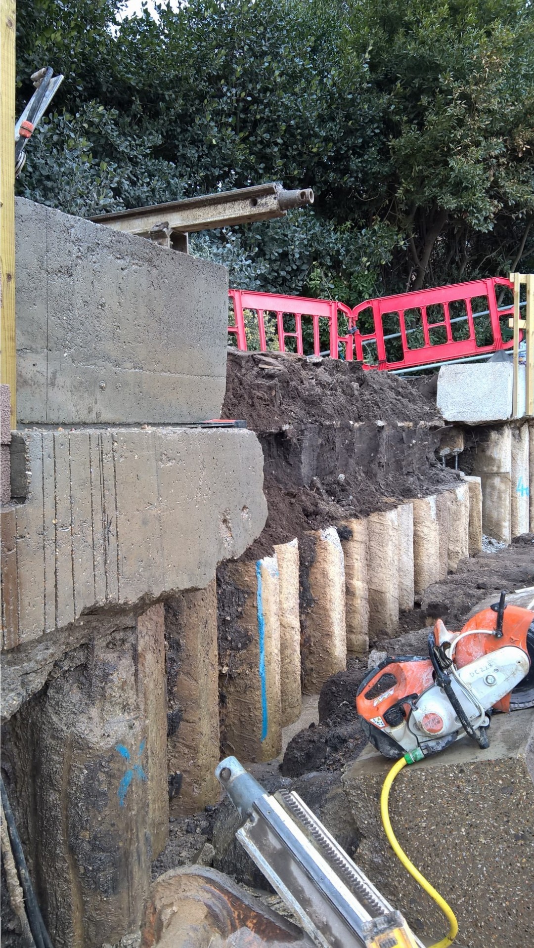 We were not allowed to remove the sub soil from behind the piles due to it being a sensitive area, otherwise the 3 phase hydraulically powered wire saw would have been another viable option. This gives you the ability to fix in one position and direct the diamond beaded wire to different locations using guide wheels. A very effective method when room is an issue, and others such as working from height, confined space, structural instability, all a huge problem within the industry.